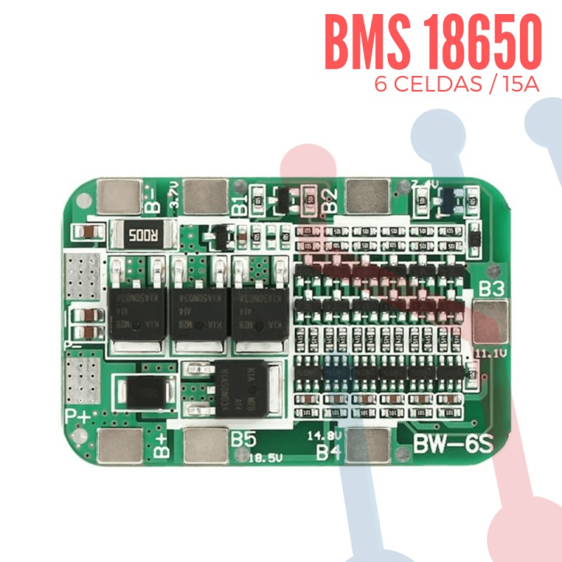 La Placa BMS para 6 baterías Li-Ion 18650 gestiona y protege el pack controlando carga, descarga, sobrecarga, sobredescarga y cortocircuitos para mayor seguridad y vida útil.