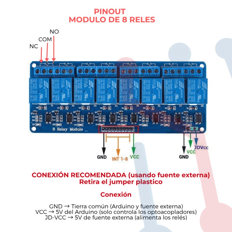 Nota: Si el módulo se va a alimentar desde arduino dejar jumper entre VCC JD-VCC ( dejar GND Libre)