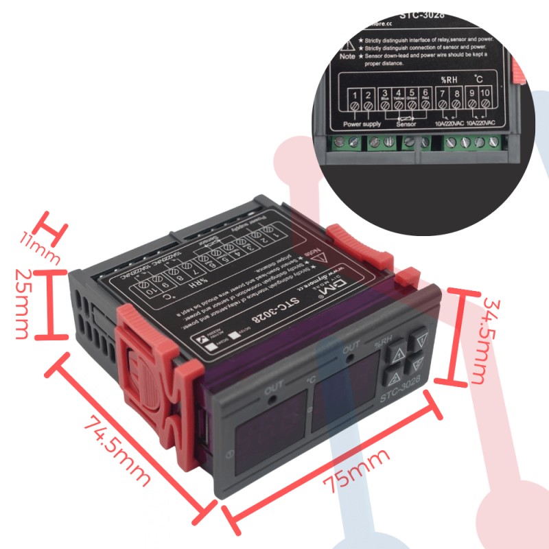 El termohigrómetro digital STC-3028 controla con precisión la temperatura y la humedad. Ideal para incubadoras, acuarios, tanques de agua, sistemas de enfriamiento y otras aplicaciones que requieren un control ambiental confiable.