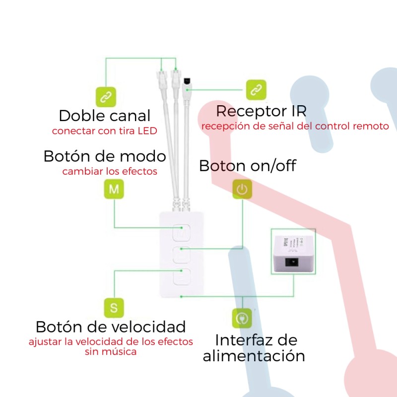 Controlador LED de música WiFi SP511E para tira LED RGB direccionable WS2812b/WS2811, con salida dual, control remoto y control por voz inteligente vía Alexa.