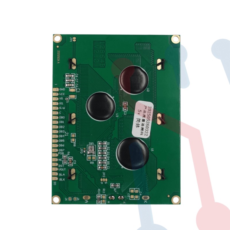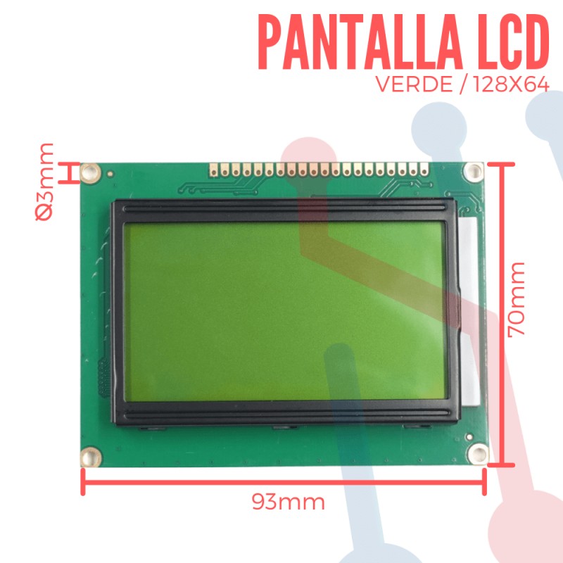 Pantalla LCD gráfica de 128x64 píxeles con retroiluminación verde, ideal para mostrar texto, menús e imágenes simples. Compatible con microcontroladores como Arduino, PIC, Raspberry Pi y shields de impresoras 3D.