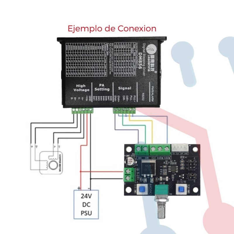 Módulo generador de pulsos , diseñado para controlar motores paso a paso a través de un driver externo, permitiendo ajustar velocidad y dirección del movimiento.